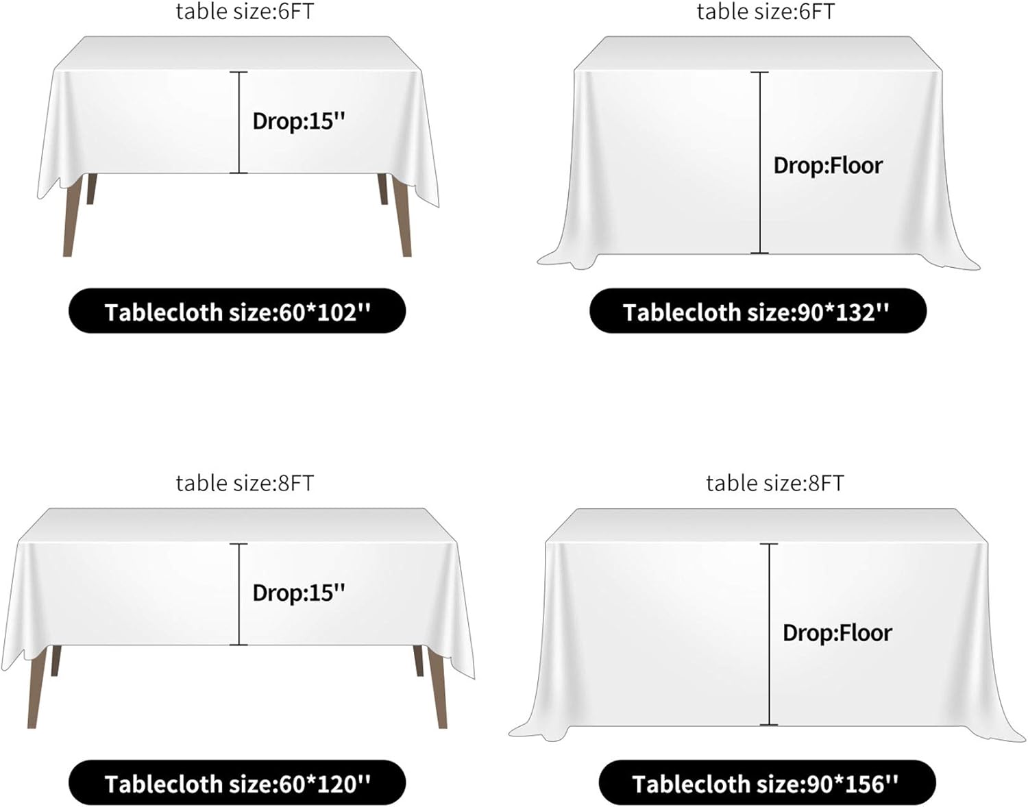 - 2 PACK SET, MORE ECONOMICAL: Each pack include 2 pcs of rectangular tablecloth, measuring 90”x156” each. Durable for repeat use, cheaper than renting.We also have 6 pack set and 12 pack set,which will save more.