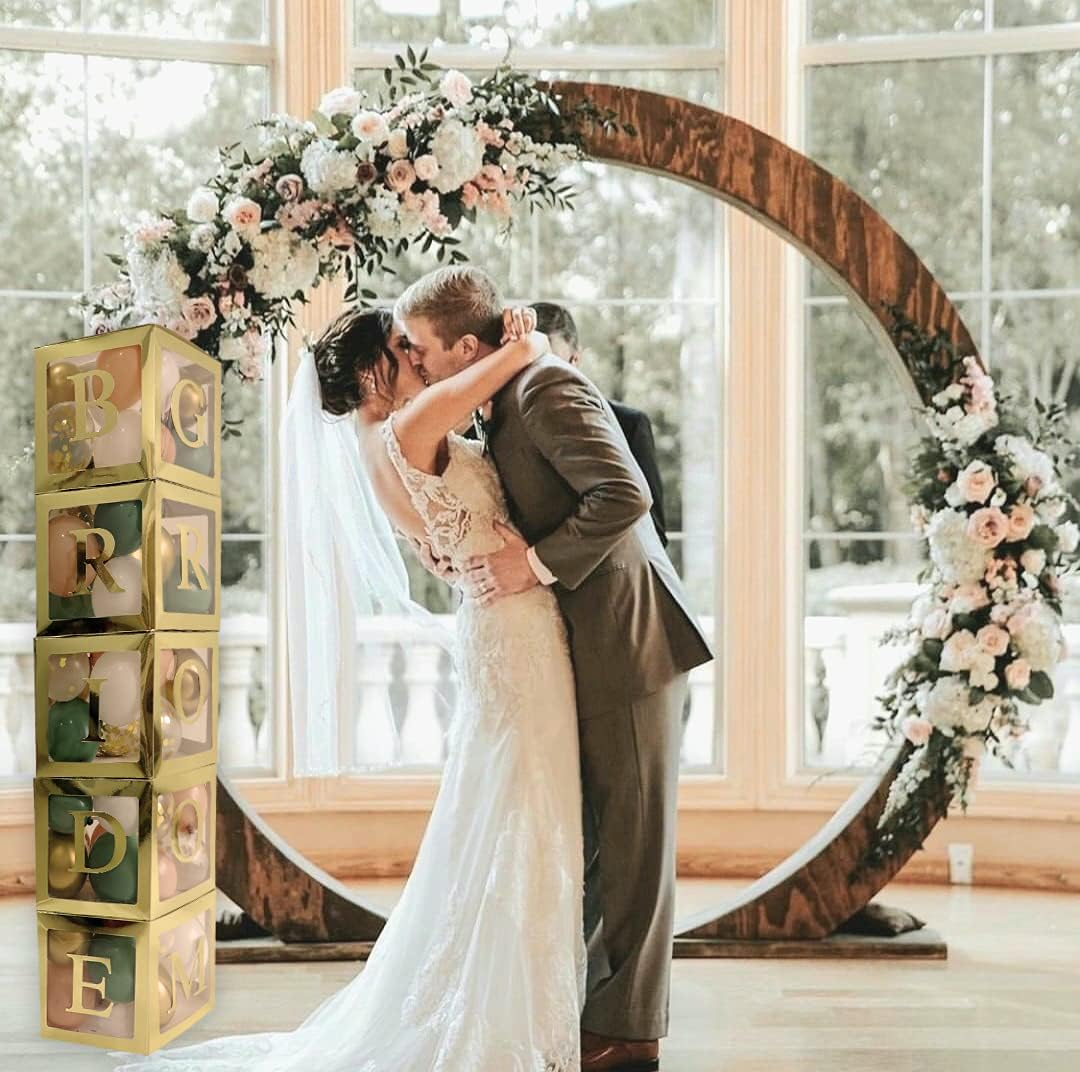 96 PC Bridal Shower Decorations Balloon Boxes Gold- Transparent Block with BRIDE TO BE + GROOM + A - Z Letters and 40 Balloons- Engagement Bachelorette Parties Weddings Centerpieces Photo Booth Props