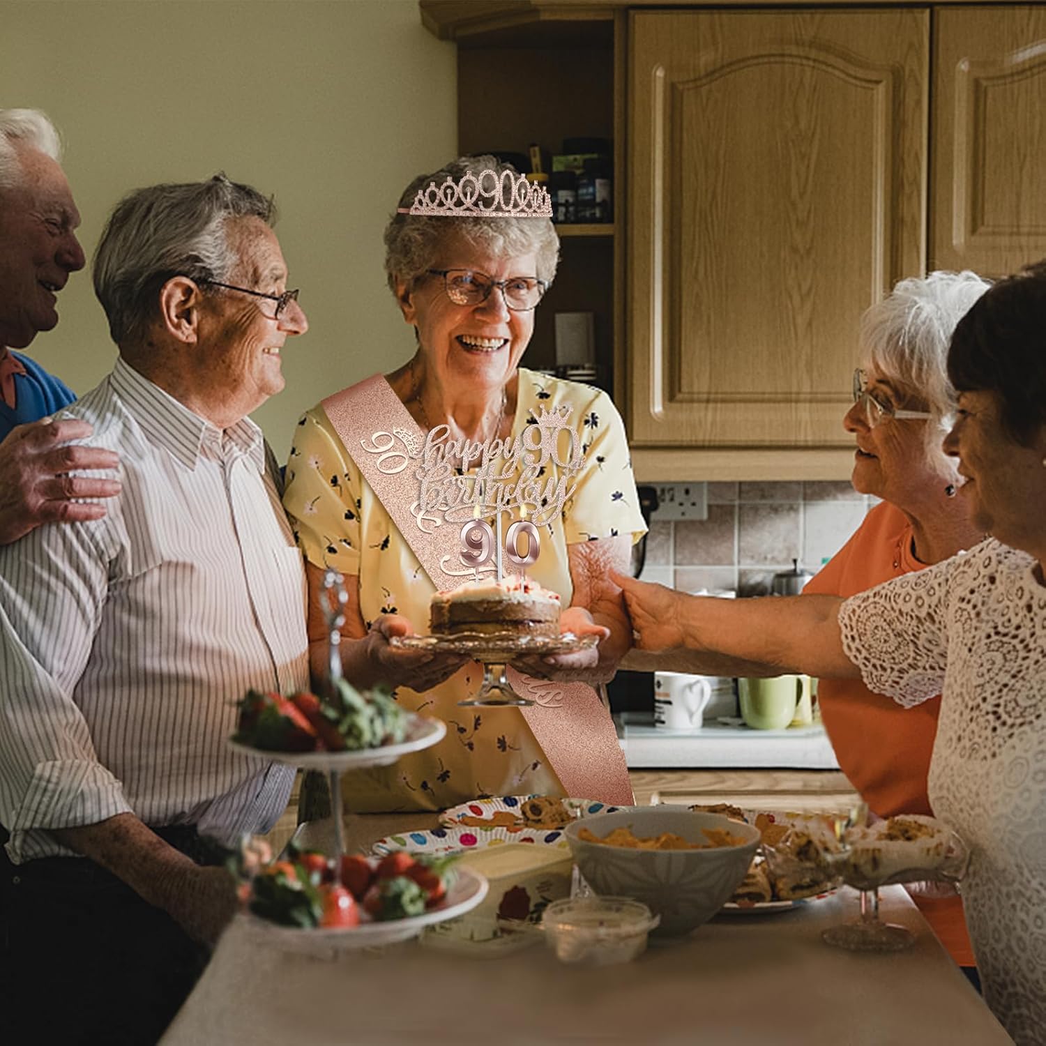 - Birthday Party Decorations for Women: 90 birthday sash women *1pc, glittery 90 tiara/crown *1pc, Happy 90th Birthday Cake Topper *1pc, 9+0 Numeral Candles *1set.