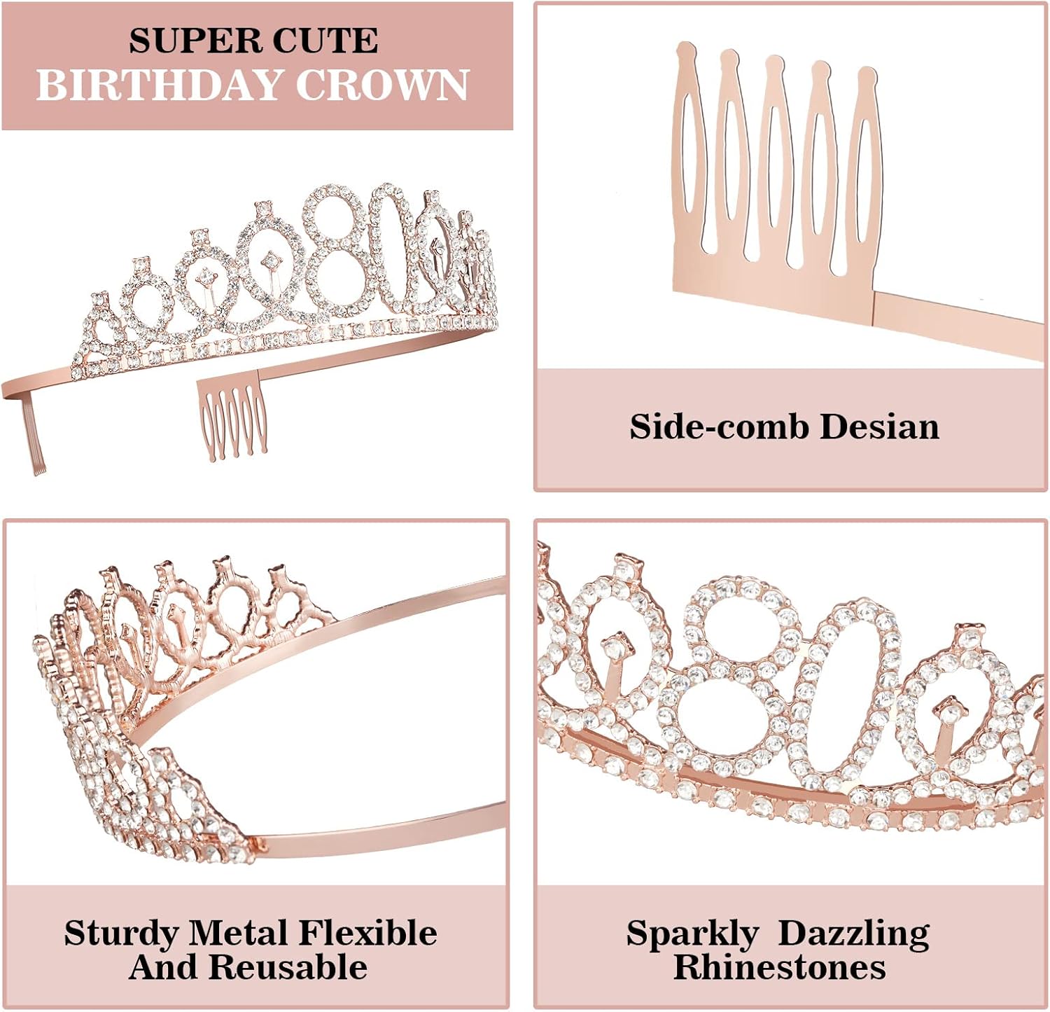 - 80th Birthday Crown for Women: Made of high quality alloy and rhinestone. Rose gold 80th birthday tiara with combs that make sure it can grip the hair more tightly for fitting women. Dimension: 5.12” on the front side