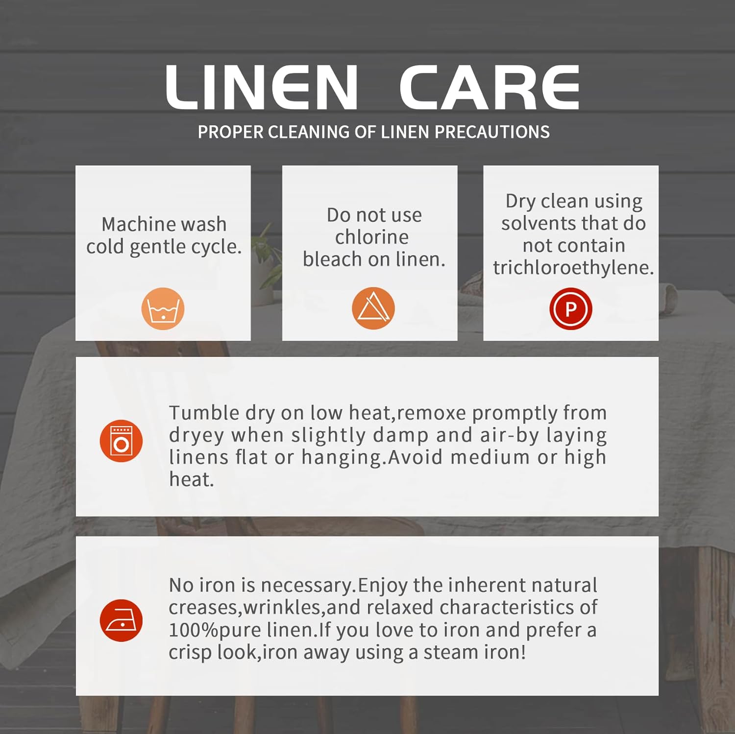 - CARE INSTRUCTION: Do not bleach, dry clean, or use detergent with chlorine. Machine wash cold separately with a gentle cycle. Low tumble dries or iron if needed. It is normal for some lint in the first few washes, regular washing will make linen table clothes softer
