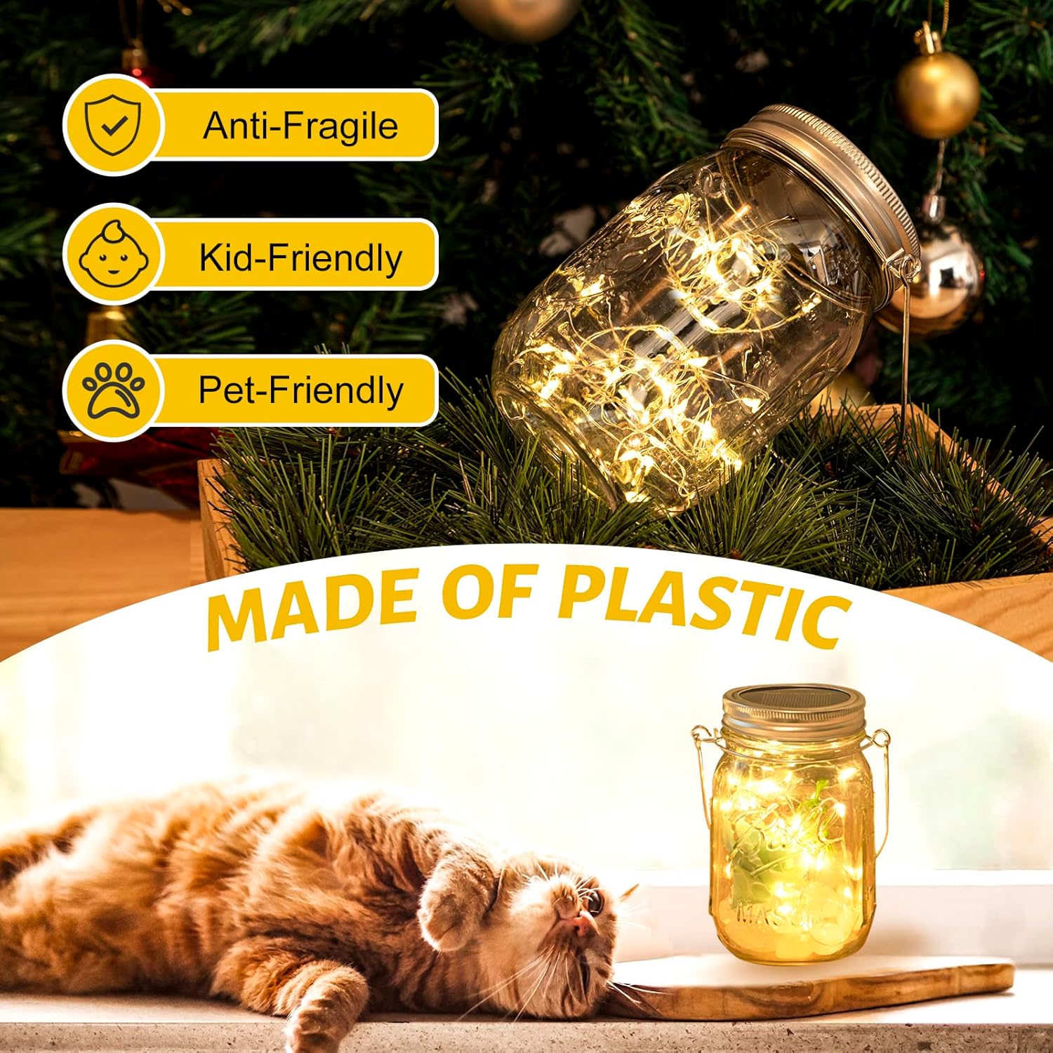 - 8 Pack Mason Jar Solar Lanterns: High-quality and durable clear plastic material jar, made of 30 warm white bright LED beads twisted into a silver wire; Unlike glass jars, our jars are lighter, more durable, can serve for a long time and unbreakable; 8pcs stainless steel hanger are included to help you easily hang the assembled mason jar lights on thinner branches, fences, walls and porches, very convenient