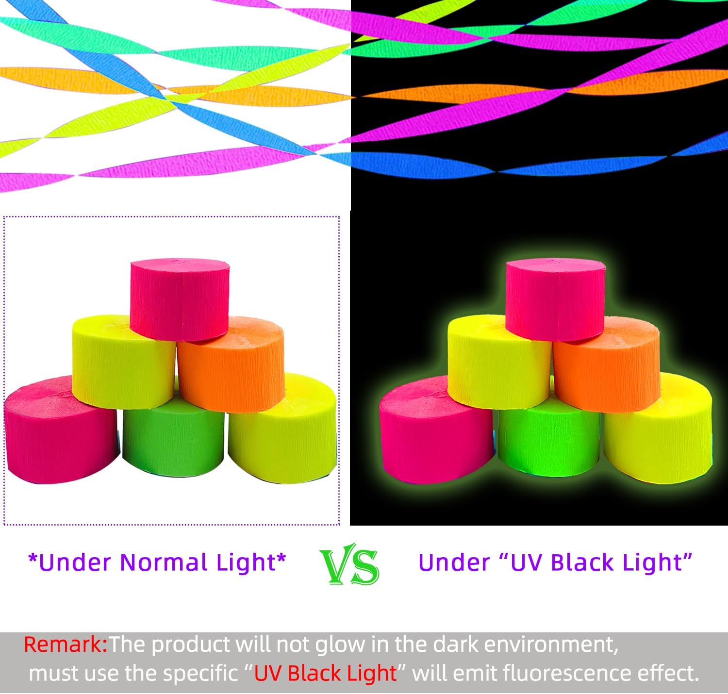 - 【All OCCASIONS 】Our luminous Crepe Paper Streamers perfect for blacklight dark glow party decorations, they will glow in the black light,birthday party,anniversary,festival celebrations, blacklight party.which is very suitable for your neon theme or luminous birthday party.