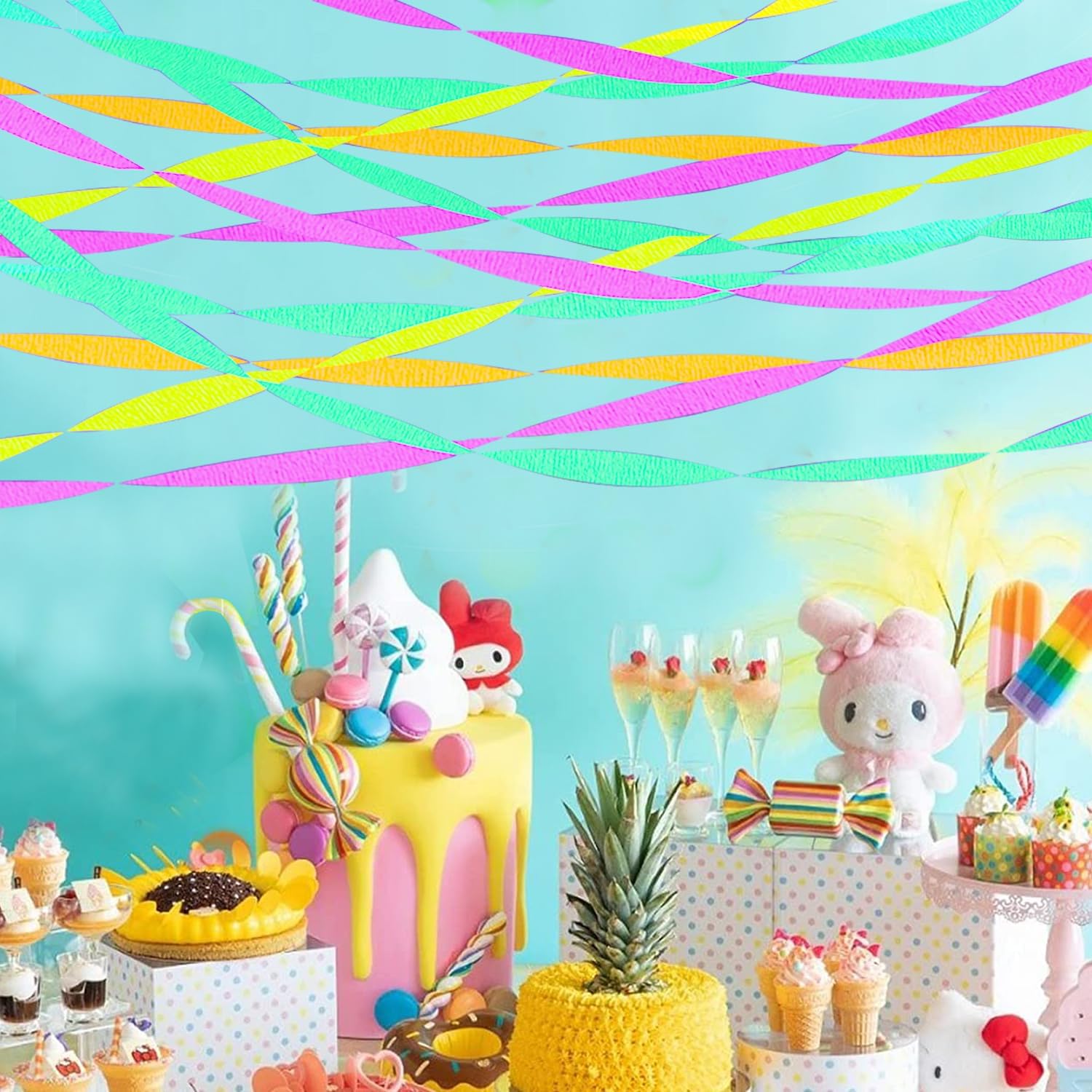 - 【GREAT VALUE】 8 Rolls Crepe paper streamers color in green, orange, yellow ,pink. 800 feet/Each roll measures approx. 1.6 inches in width and 100 ft in length. They can emit bright colors under normal light, but they glow under black light, exquisite decorations can make your party more attractive!