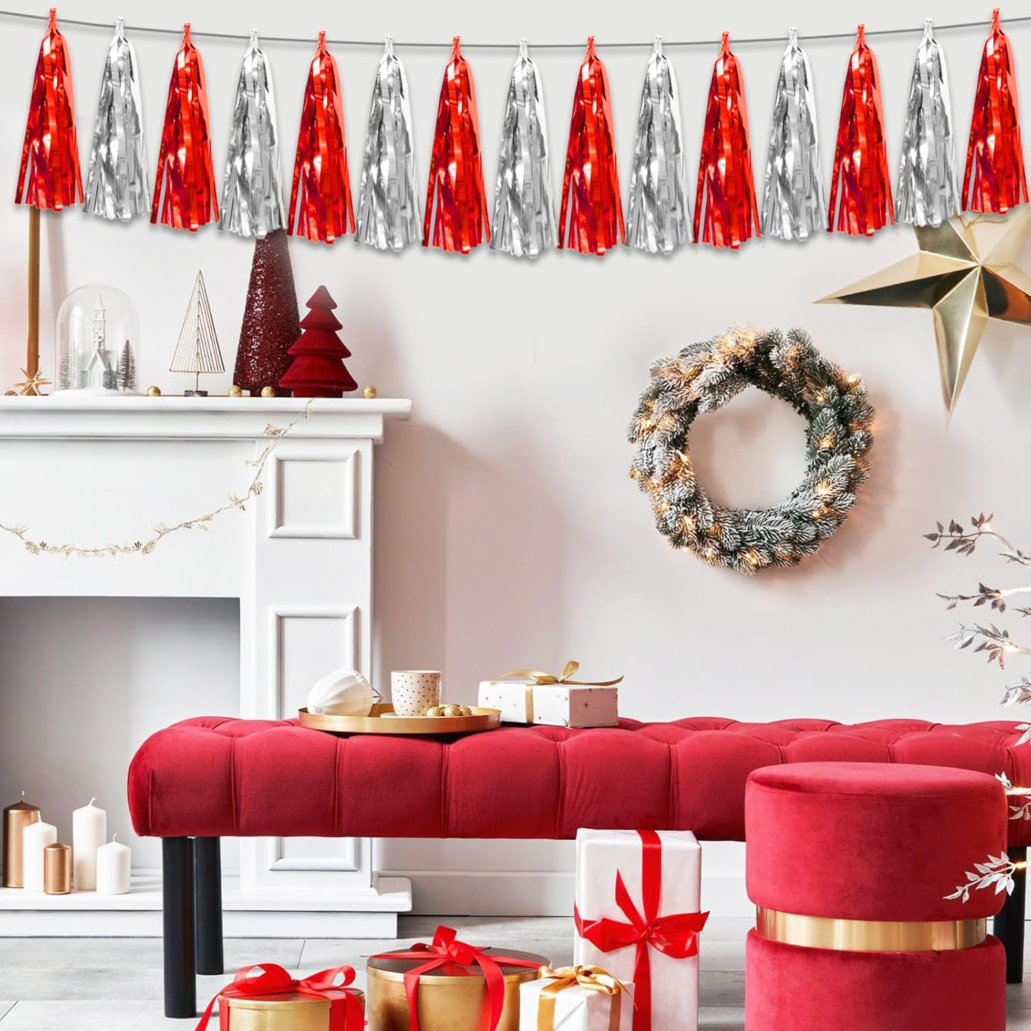 8P Red Silver Foil Fringe Metallic Tassel Streamers Banner Tassel Garland for Parade Floats, Bachelorette, Wedding, Birthday, Halloween, Christmas, Bridal/Baby Shower Party Decorations