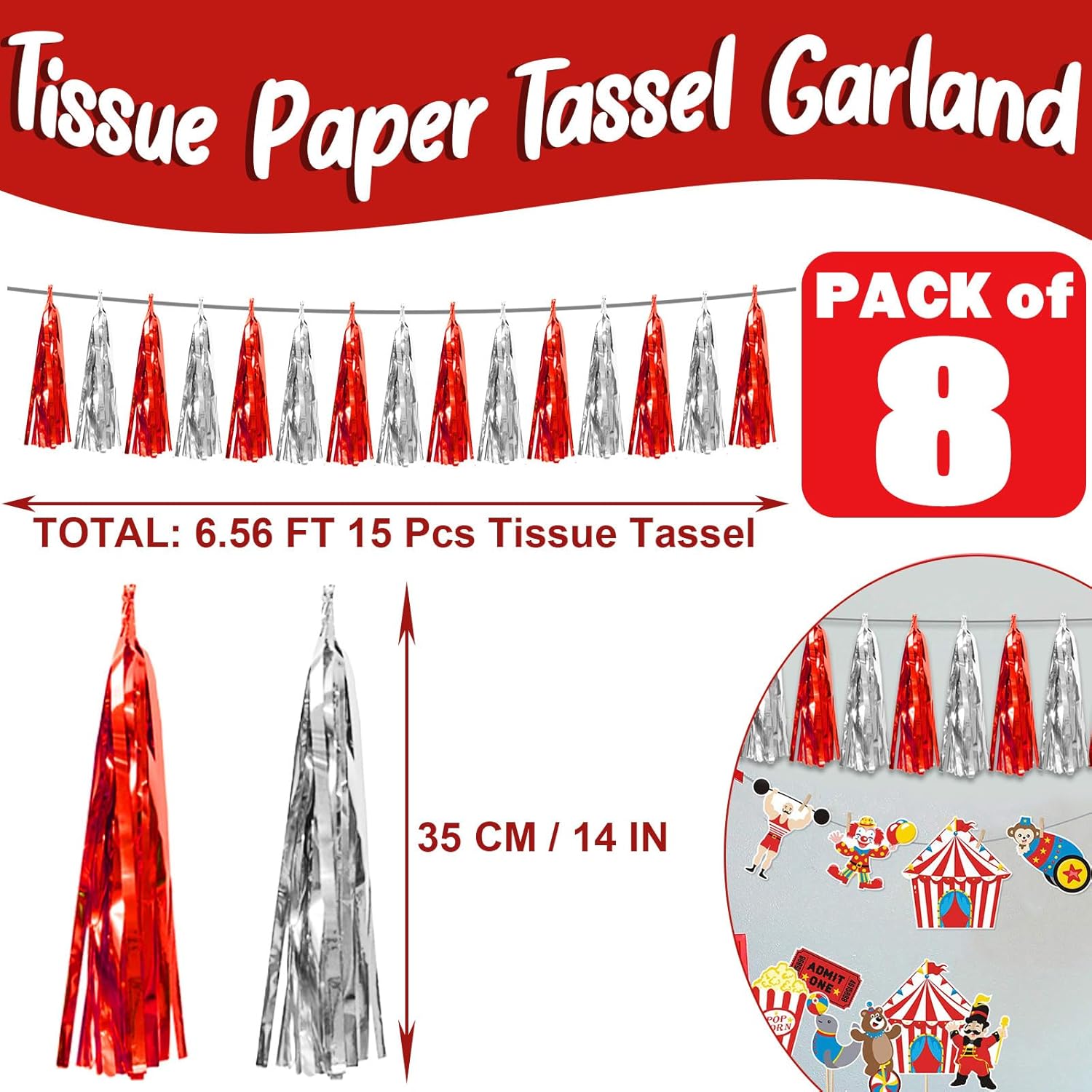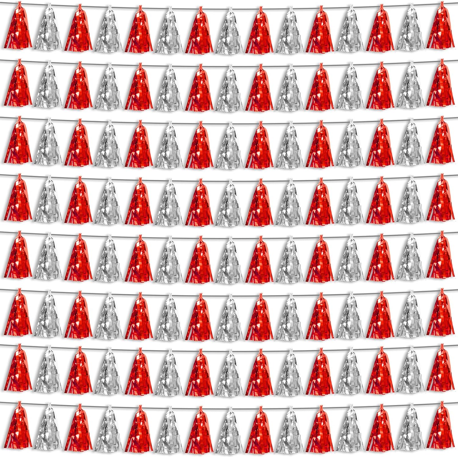 - 【Red Silver Party Supplies Set】: The total length of the Red Silver birthday tassels banner is 78.7 feet 120tassels, divided into 8 strips, each 9.8 feet long. Each banner contains 15 tassels, and each tassel measures 14 inches, for birthday decorations many occasions, and so on