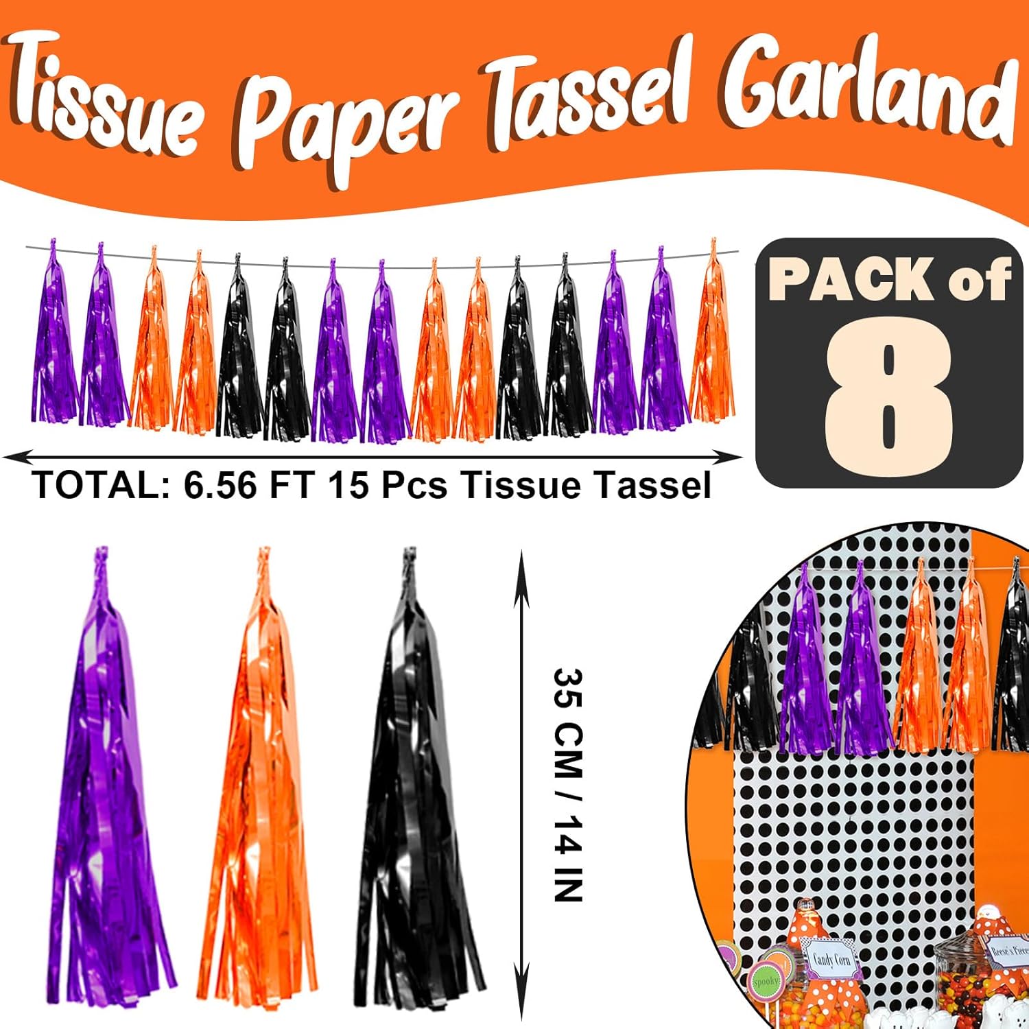 - 【Purple Black 0range Party Supplies Set】: The total length of the Purple Black 0range birthday tassels banner is 78.7 feet 120tassels, divided into 8 strips, each 9.8 feet long. Each banner contains 15 tassels, and each tassel measures 14 inches, for birthday decorations many occasions, and so on