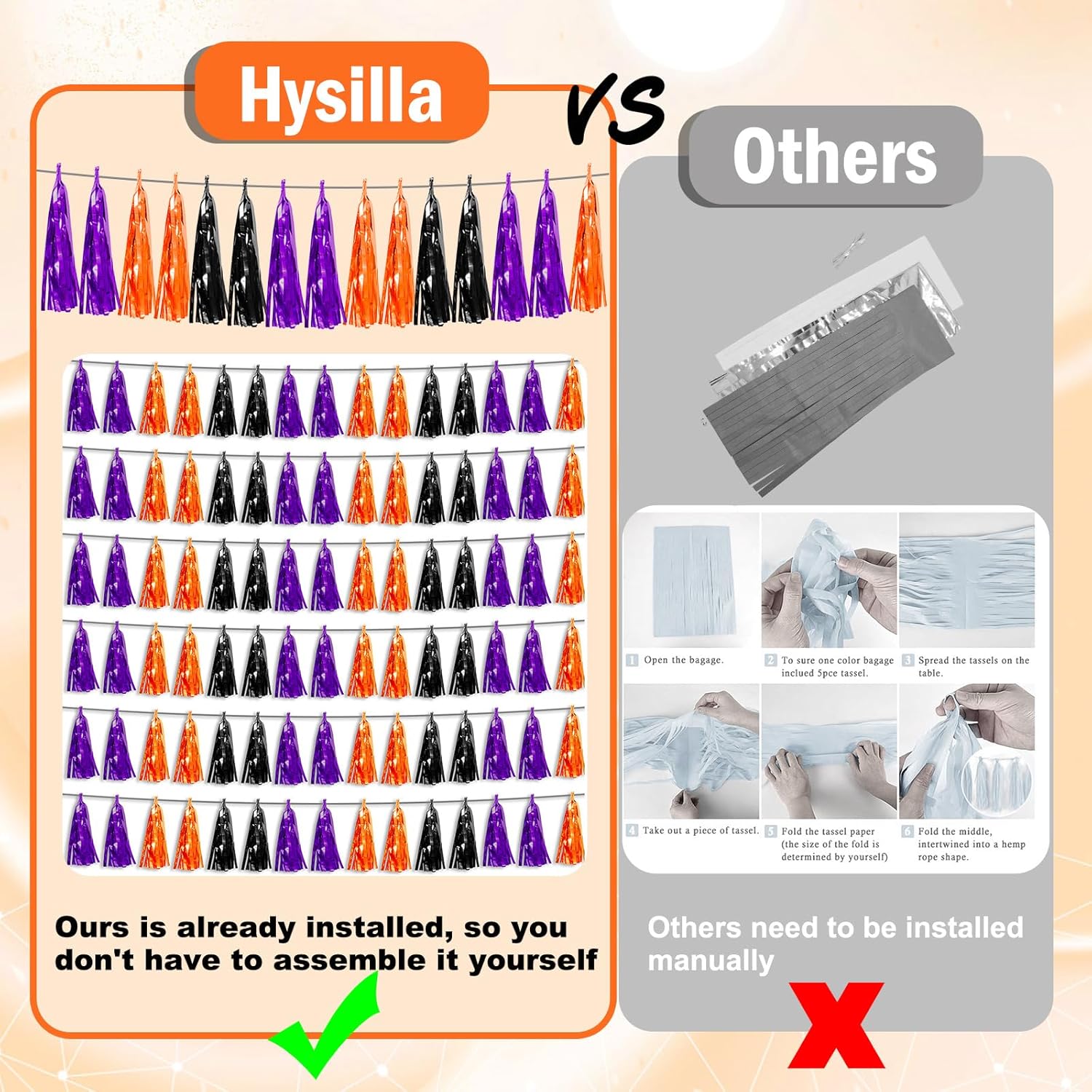 - 【Perfect Party Decoration】The Purple Black 0range tinsel garlands are designed in a metallic Fringe, bright, and beautiful, at the same time, they shine in the sun, and these gorgeous tassel garlands create a wonderful backdrop or centerpiece for your party space. and bring you, your family, and your friend's good Visual effects. your party many emotional and touching moments where a lot of pictures will be taken and everybody will have a wonderful time together.