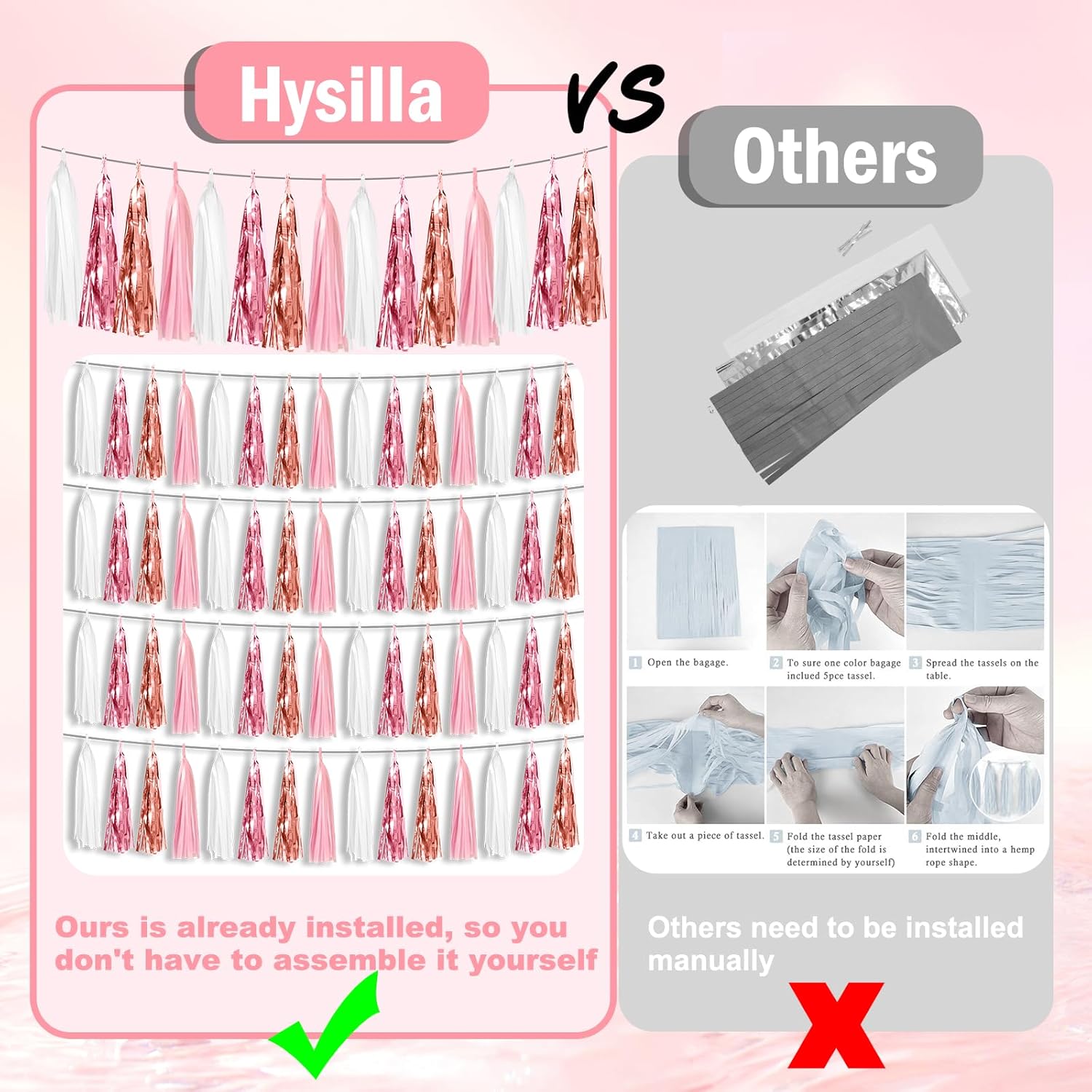 - 【Pink White Peach Rose Gold Party Supplies Set】: The total length of the pink white peach rose gold birthday tassels banner is 78.7 feet 120tassels, divided into 8 strips, each 9.8 feet long. Each banner contains 15 tassels, and each tassel measures 14 inches, for birthday decorations many occasions, and so on