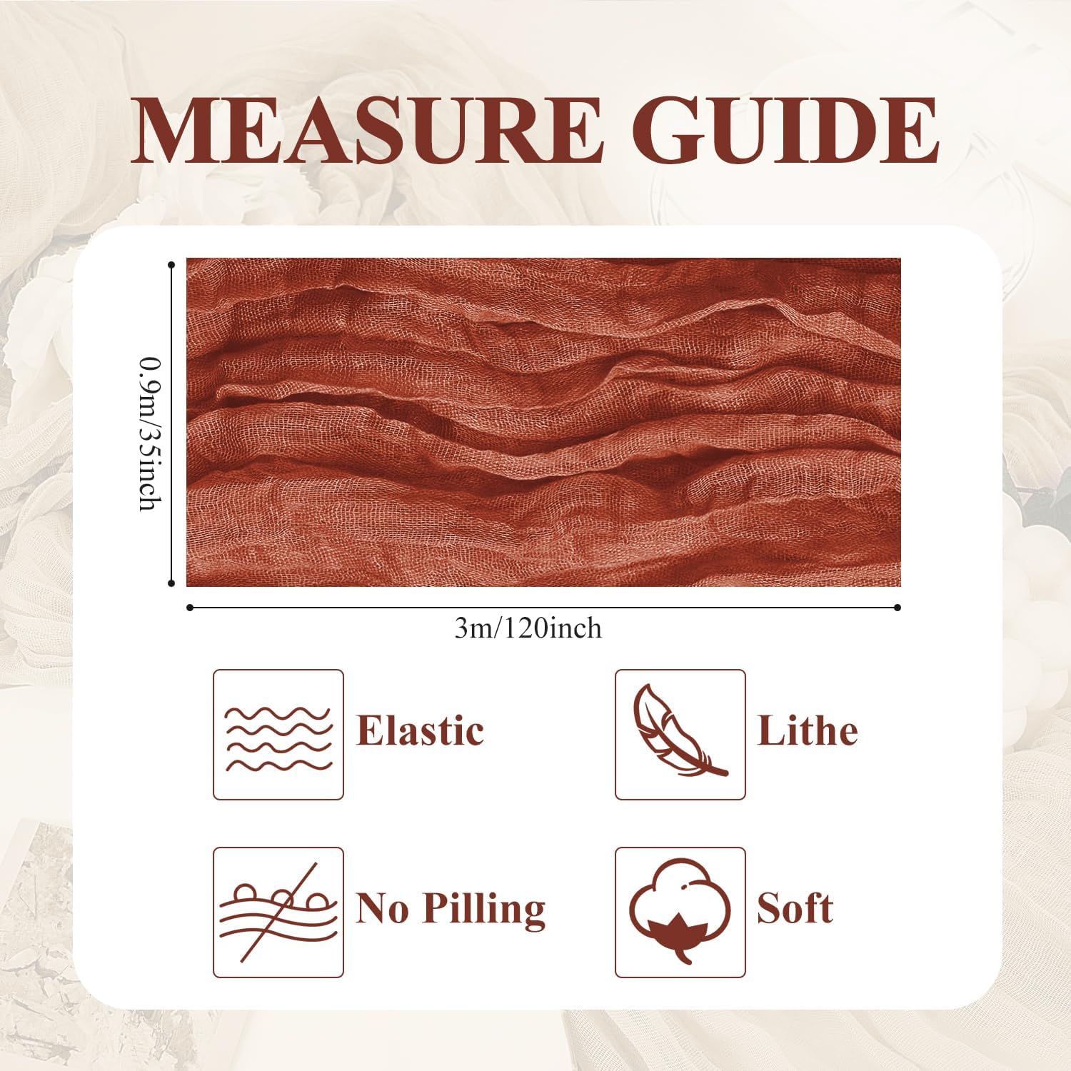 - 【Cheesecloth Table Runner】 Size: 35" W x 120" L. You will get 2 pieces 10FT length cheesecloth table runner. The sheer rustic table runner is long enough to span a large table and drape gracefully across the table. It will gently sway in the wind, adding a romantic atmosphere to your occasion. These eye-catching gauze table runners are ideal for arranging an elegant, stylish tablescape.