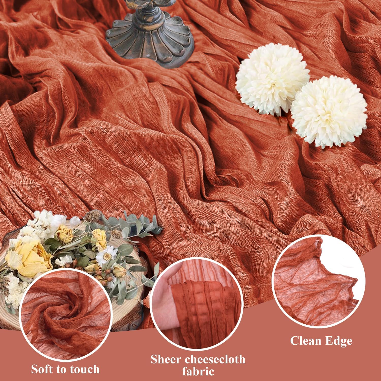 Asee'm 2pcs Cheesecloth Table Runner 120 Inches Long Terracotta Boho Gauze Cheese Cloth Runner 10FT Rustic Sheer Fall Table Runners for Thanksgiving Christmas Wedding Party Baby Shower Decoration