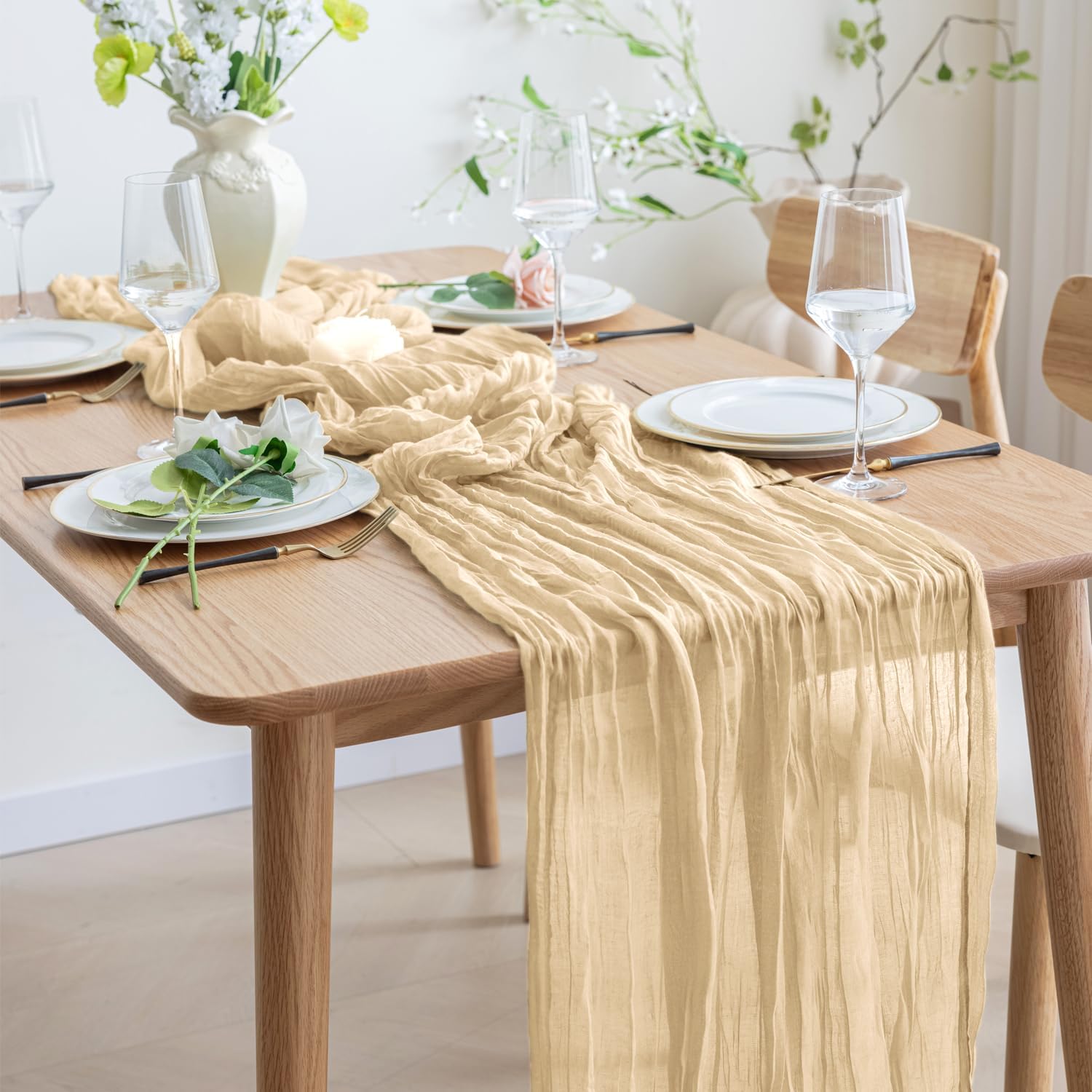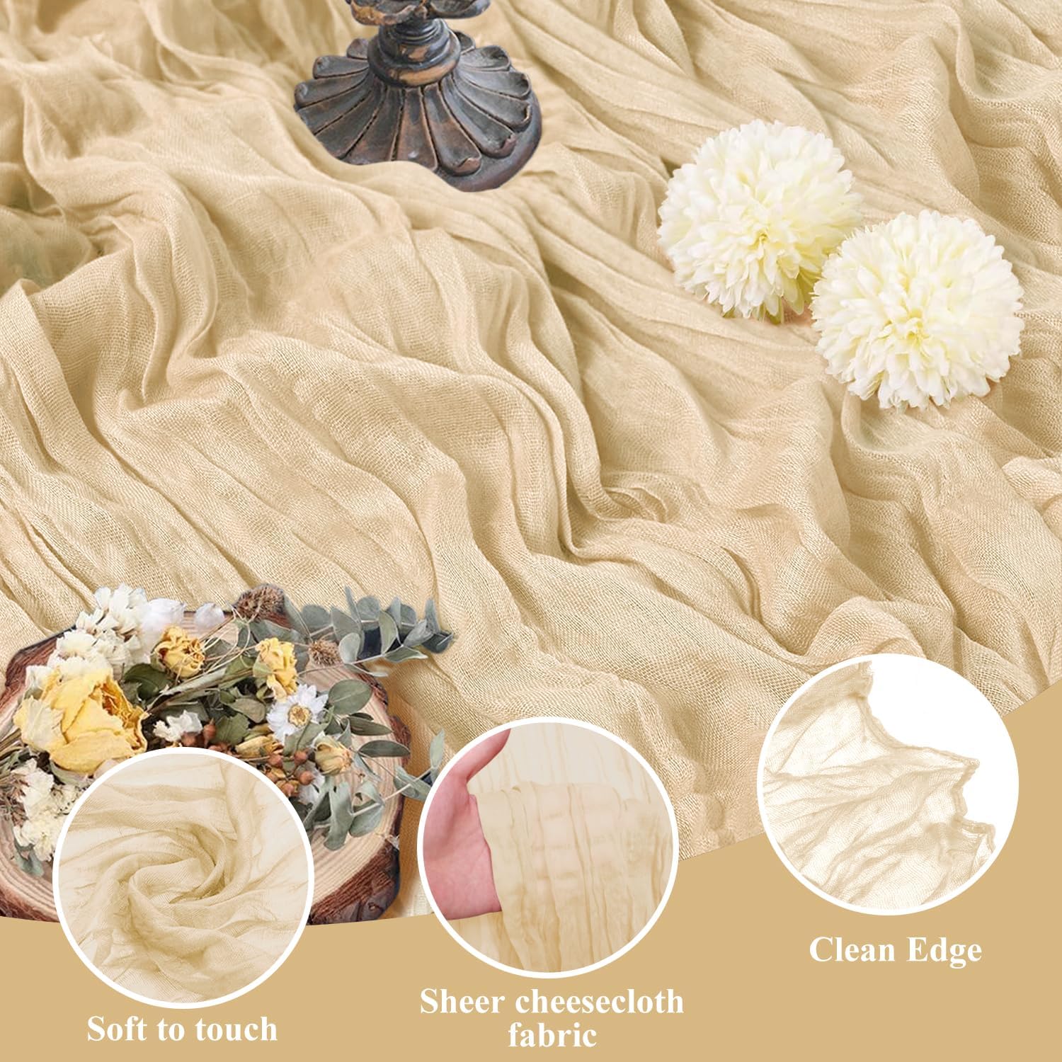 Asee'm 2pcs Cheesecloth Table Runner 120 Inches Long Sand Boho Gauze Cheese Cloth Runner 10FT Rustic Sheer Table Runners for Christmas Wedding Party Baby Shower Spring Easter Decoration
