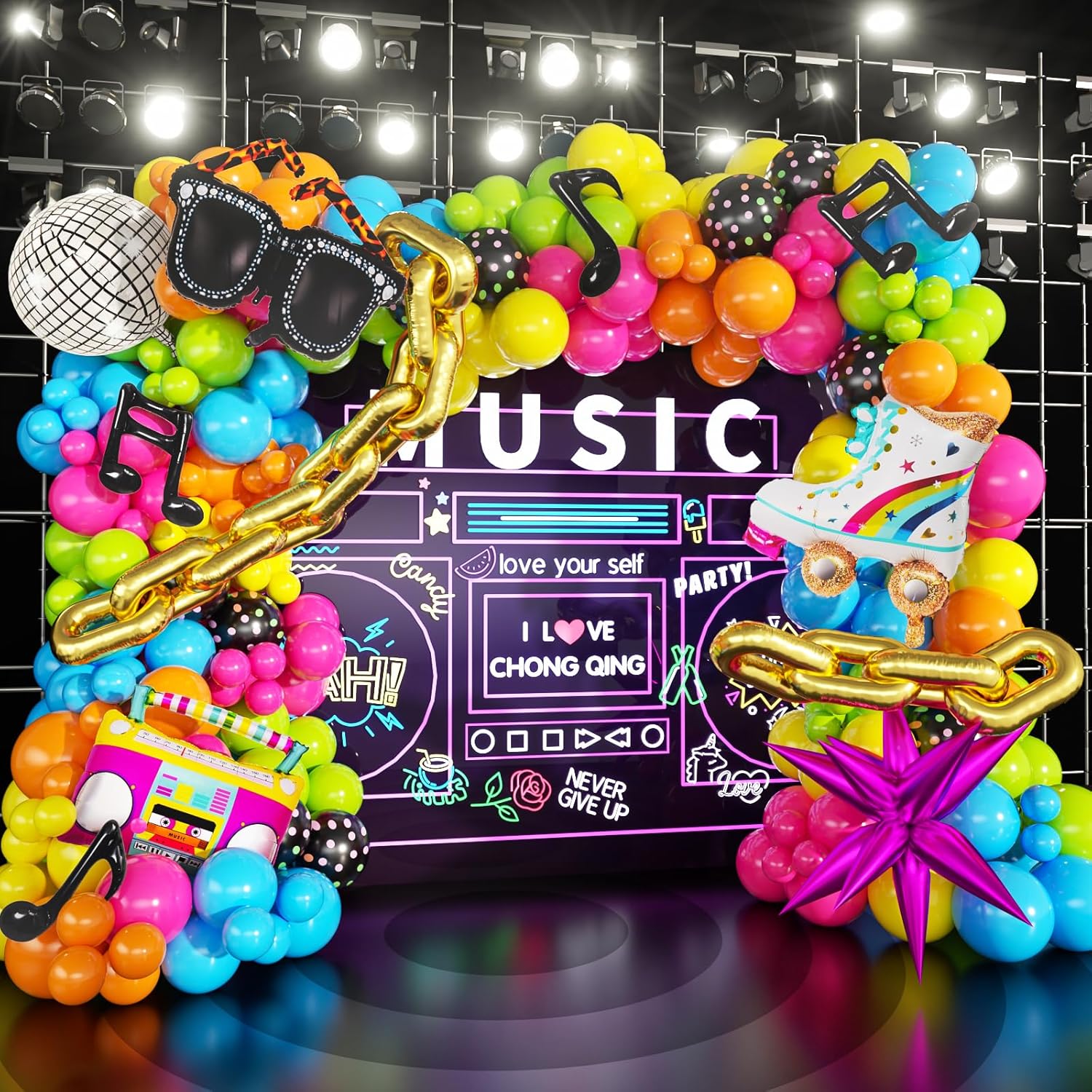 90s 80s Disco Theme Party Decorations, 171Pcs Balloon Arch Kit with Retro Disco Ball Radio Glasses Roller Skate Musical Note Chain Star Foil Balloons for Back to 90s 80s Hip Hop Birthday Supplies