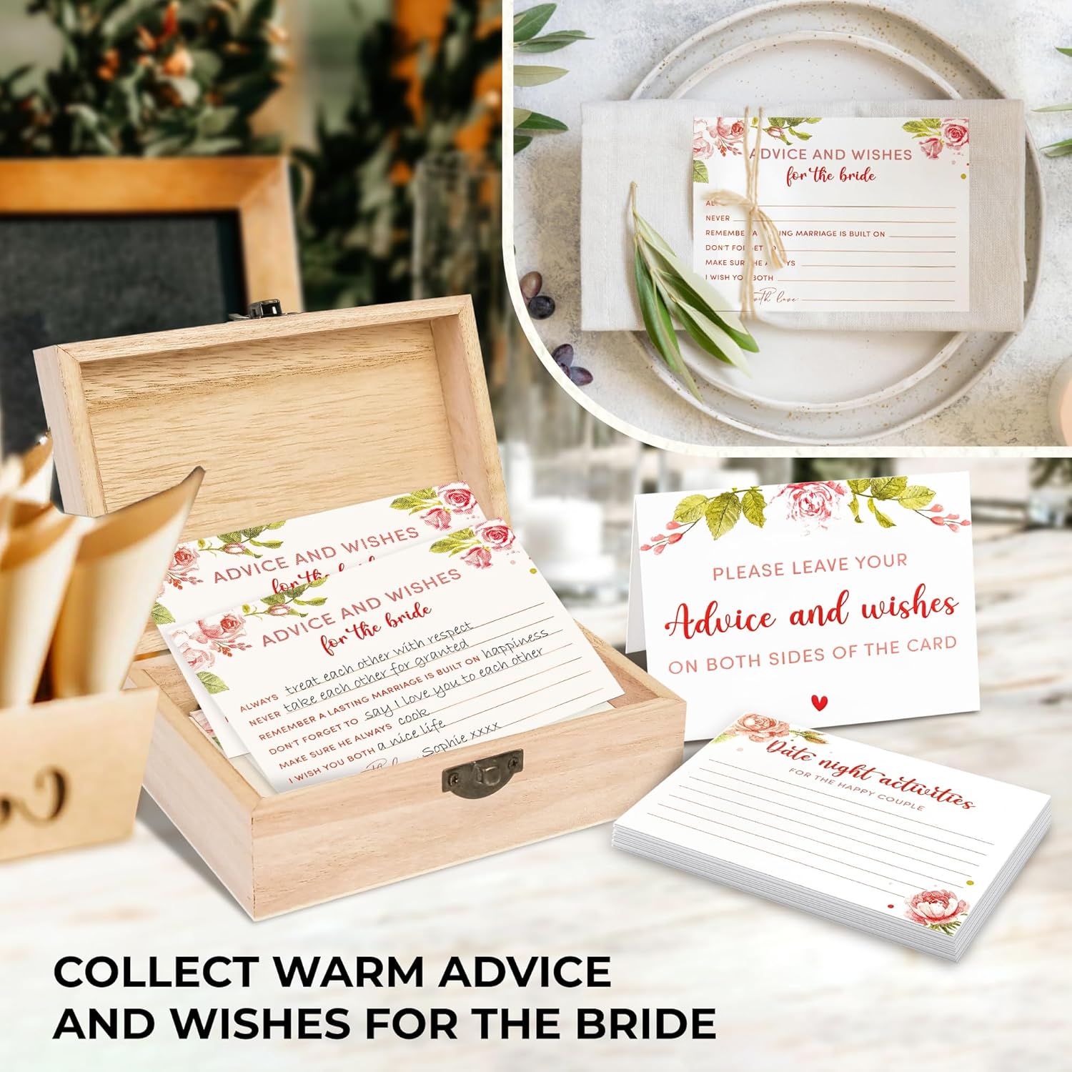 - Set Includes: The wedding shower games for reception set includes 1 wooden box measures 6x4x2.7" as wedding advice box, 50 cards with wedding wishes cards on the front, date night activities on the back, a folded instruction for bridal shower decor