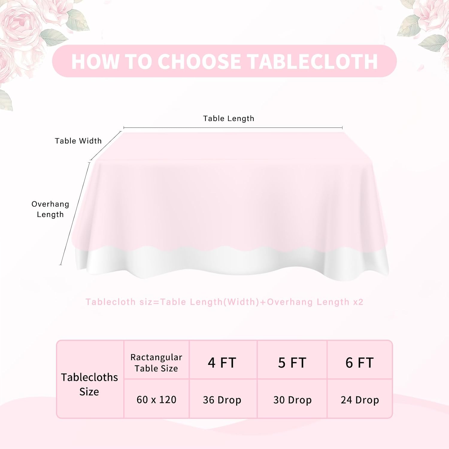 - Pink Lace Tablecloth: Piece of 2 pink lace tablecloth measuring 60 by 120 inches (10 ft) and including 4 white ribbons. Suitable for use on rectangular or round tables.