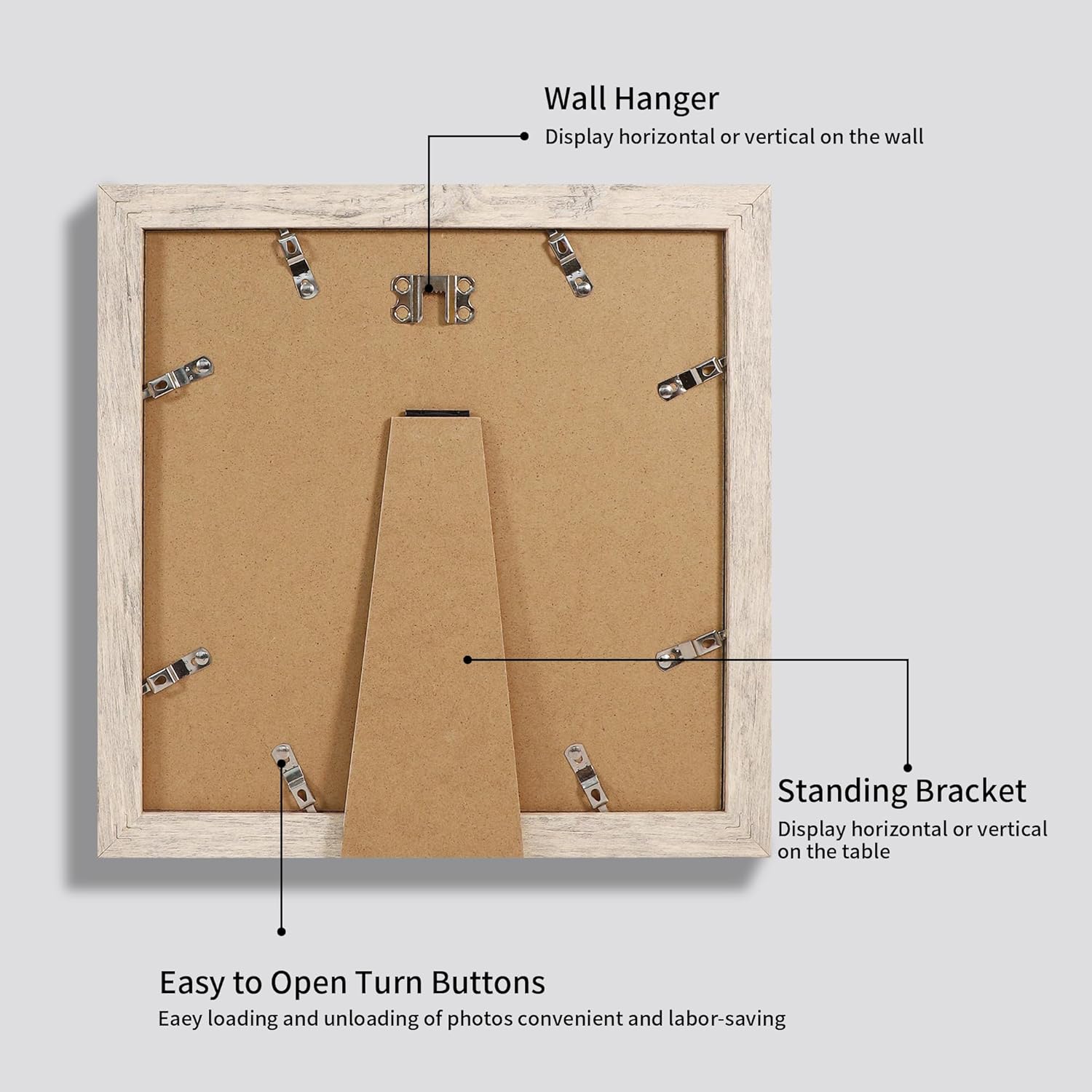 - Multi Frames Collage Set: Includes 4 frames in the same size. Perfectly fits 6x6 inch pictures with mat or 8x8 inch without mat. The frame opening display size is 0.5 inches smaller than the photo size for secure mounting.