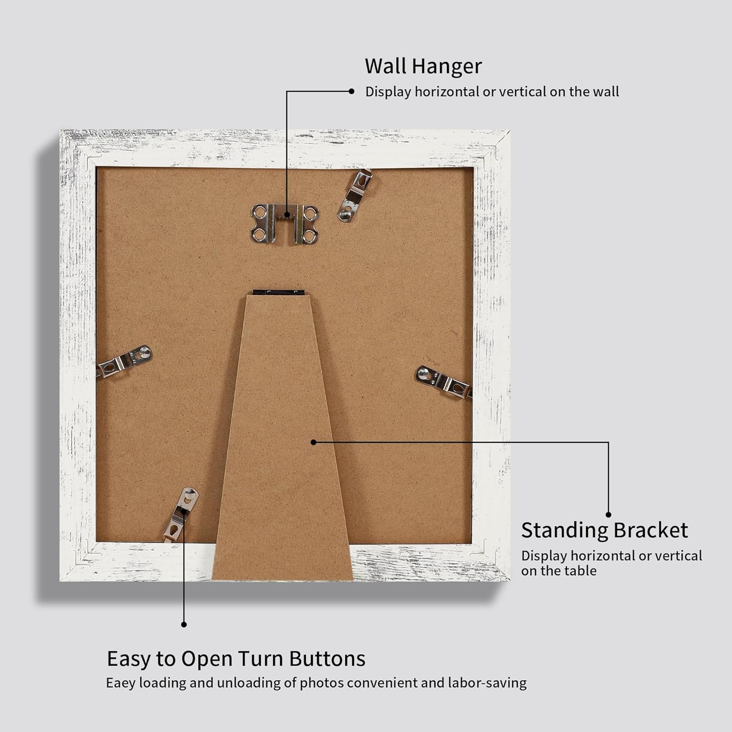- Multi Frames Collage Set: Includes 4 frames in the same size. Perfectly fits 6x6 inch pictures with mat or 8x8 inch without mat. The frame opening display size is 0.5 inches smaller than the photo size for secure mounting.