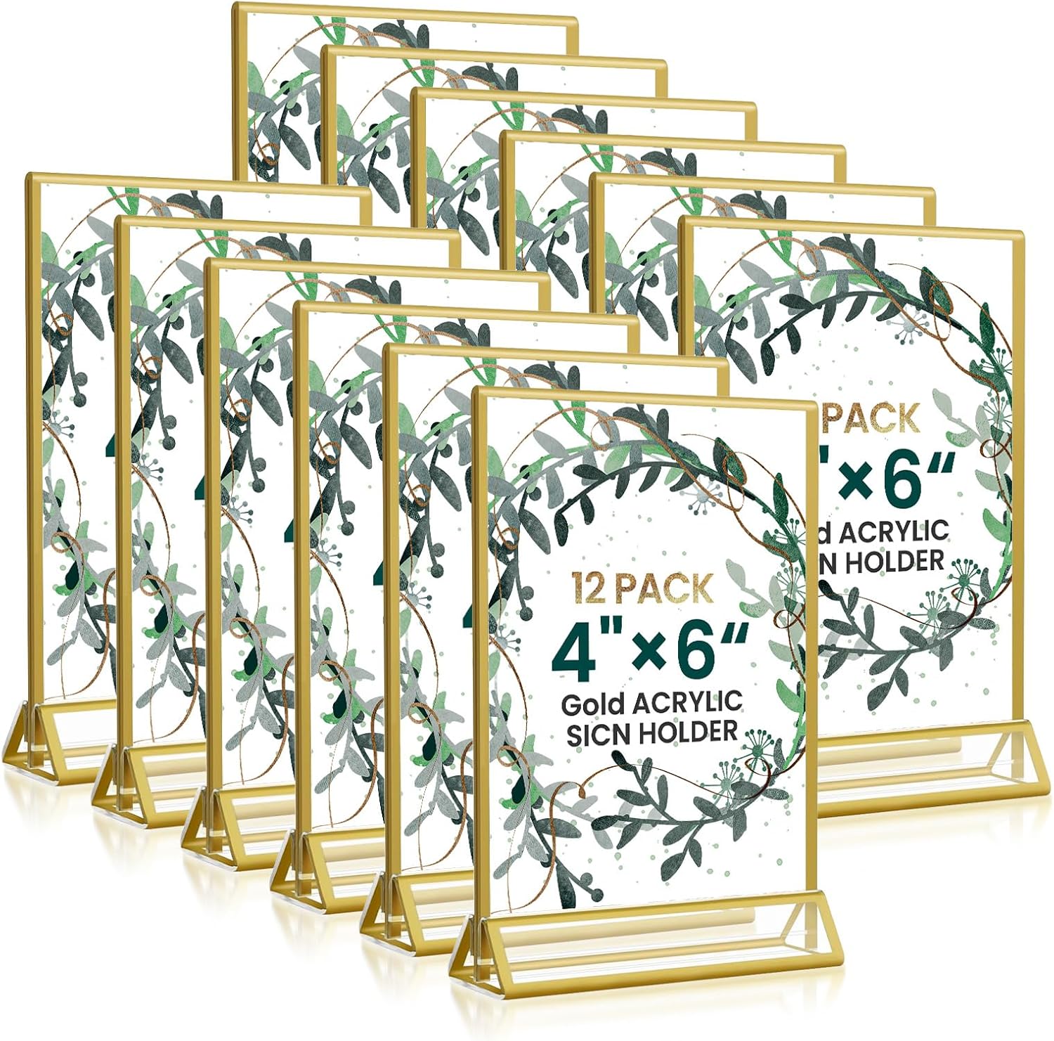 Acrylic Gold Sign Holders 4x6, 12 Pack Wedding Gold Table Number Holders, Double Sided Photo Display Picture Frame Paper Stand, Clear Flyer Stand Menu Holder for Wedding, Home, Party, Restaurant