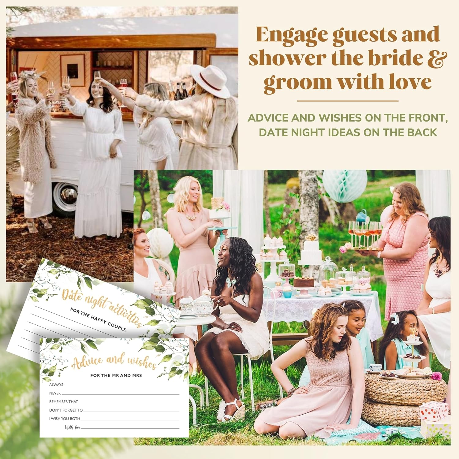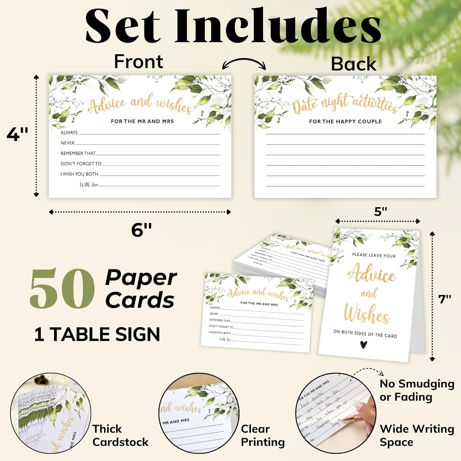 - Set Includes: Comes with 50 double-sided advice and wishes cards. One side reads "advice and wishes" and the other features date night ideas. Includes a paper sign to guide guests in sharing their advice for the groom and bride.