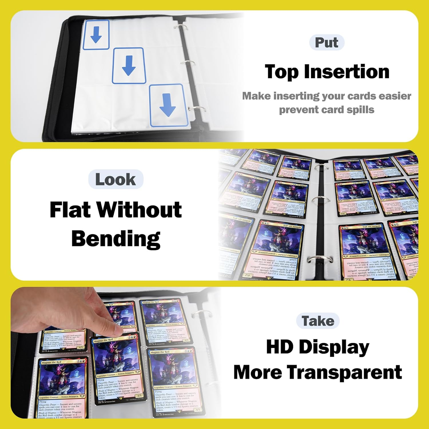 - Function : -Trading Card Binder can not only protect and organize cards, waterproof, scratch-proof, dust-proof, and anti-lost. Advanced reinforced heat-sealed seams technology for trading card binder 9 pocket, flipping through the pages like a book will different with regular MTG binder, even no rings to mess up cards. The side loading pockets also means no cards falling out if you hold the photocard collector upside down