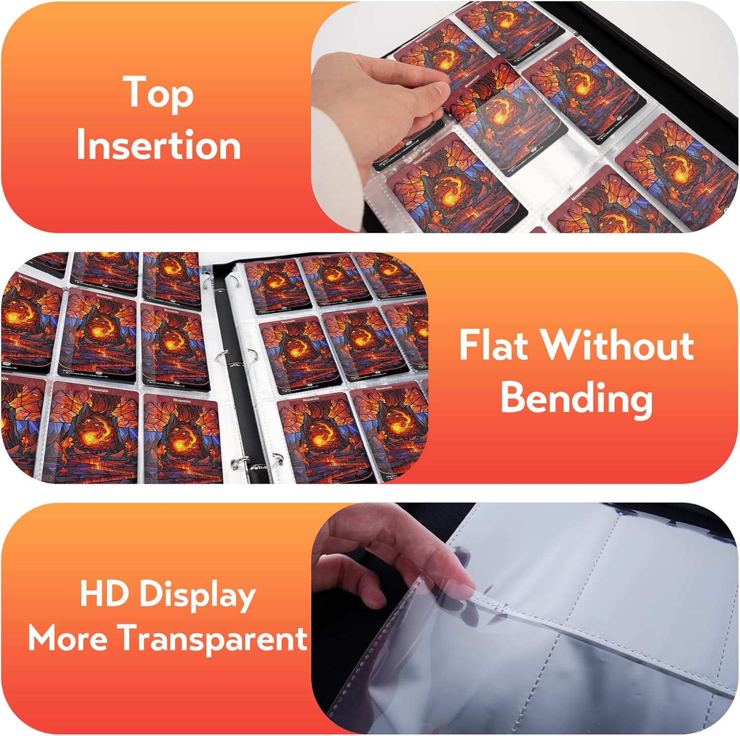 - Function : Trading Card Binder can not only protect and organize cards, waterproof, scratch-proof, dust-proof, and anti-lost. Advanced reinforced heat-sealed seams technology for trading card binder 9 pocket, flipping through the pages like a book will different with regular MTG binder, even no rings to mess up cards. The side loading pockets also means no cards falling out if you hold the photocard collector upside down