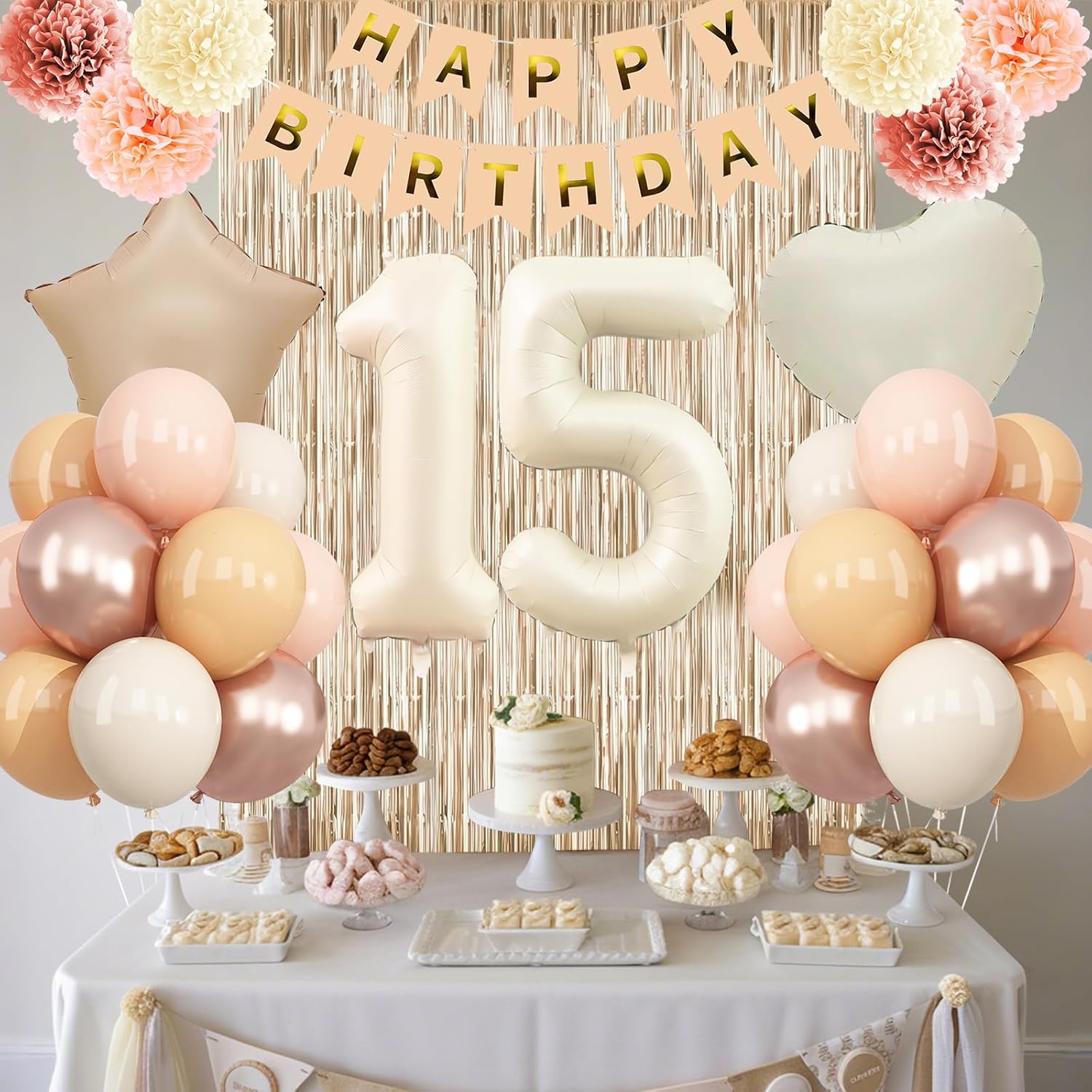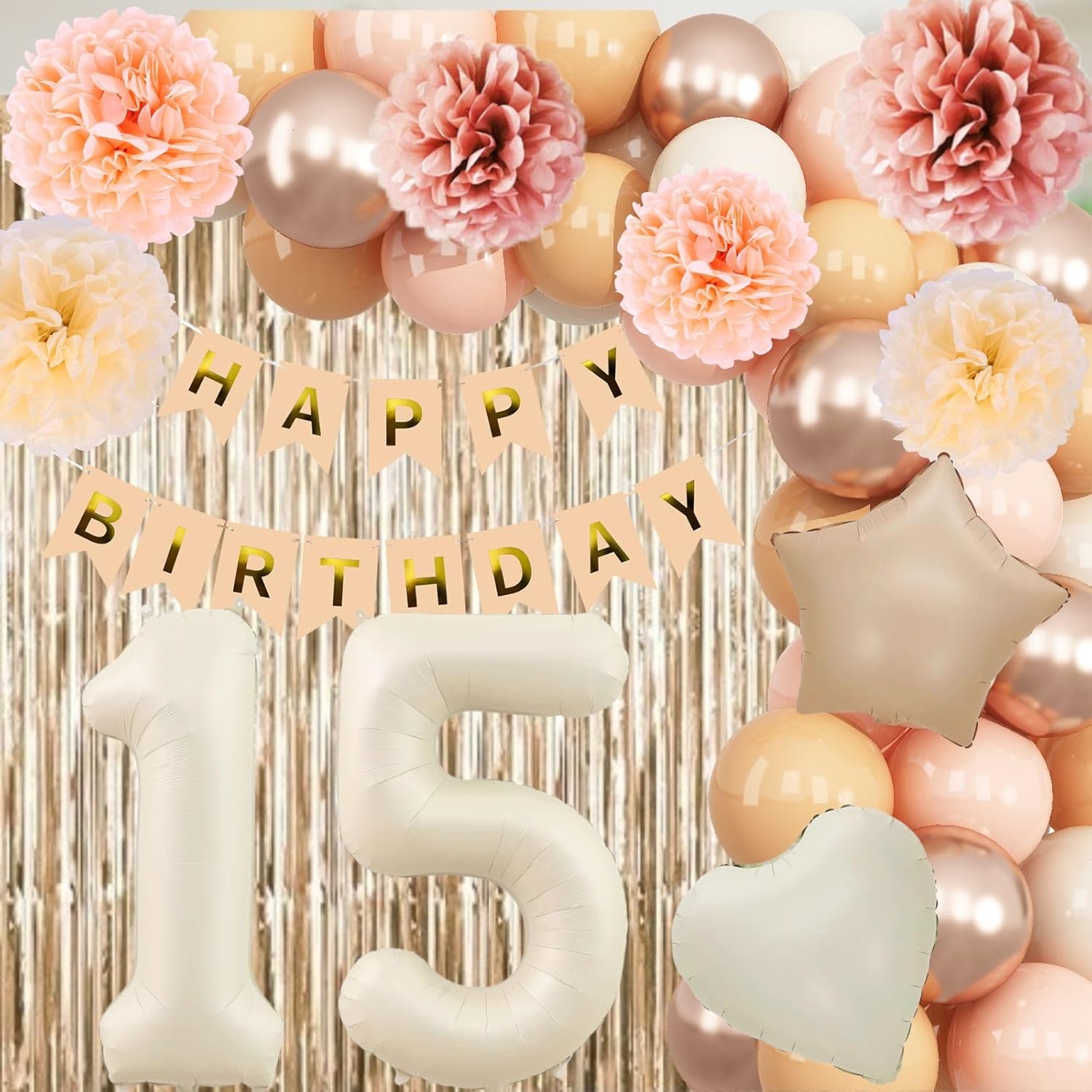 - ALL-IN-ONE DECORATION: Comes with a ā15ā foil number balloon, includes everything you need: birthday banner, fringe curtain, blush cream gold balloons, star foil balloons, paper pom poms, and ribbon, ideal for 15 year old birthdays for girls, 15th birthday party, photo shoots, and family gatherings, suits both indoor and outdoor setups