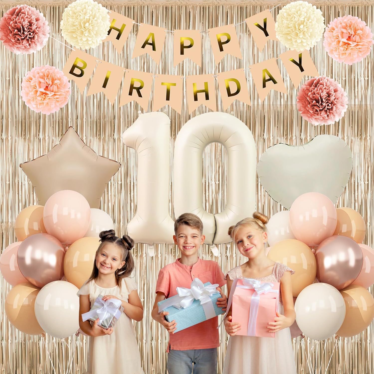 - ALL-IN-ONE DECORATION: Comes with a ā10ā foil number balloon, includes everything you need: birthday banner, fringe curtain, blush cream gold balloons, star foil balloons, paper pom poms, and ribbon, ideal for 10 year old birthdays for girls, 10th birthday party, photo shoots, and family gatherings, suits both indoor and outdoor setups