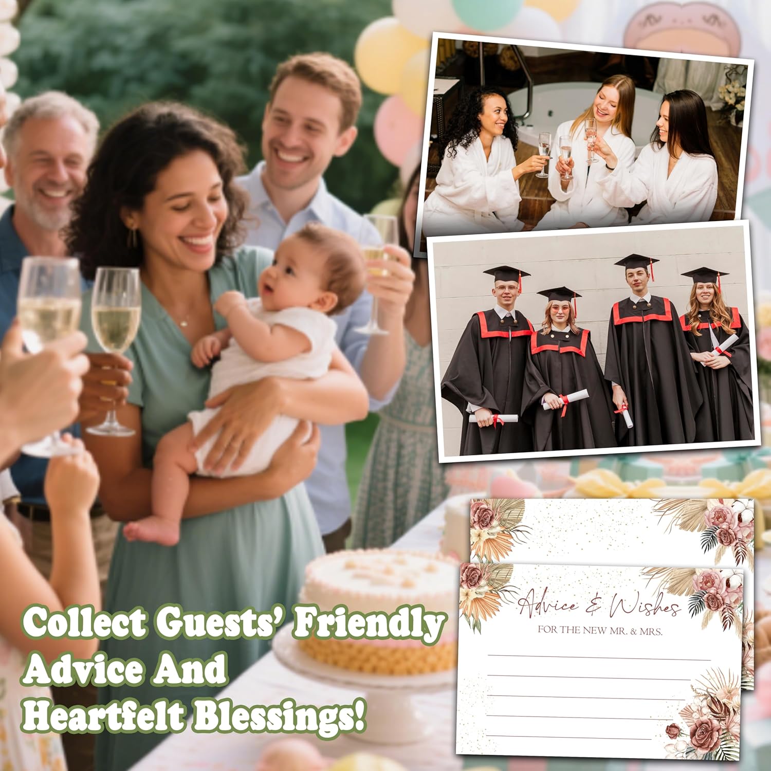 - Party essentials: Advice and wishes cards are suitable for various celebrations. Not only does it make the event more fun and enhance every guestās experience, it also creates great memories and makes your event even more memorable.