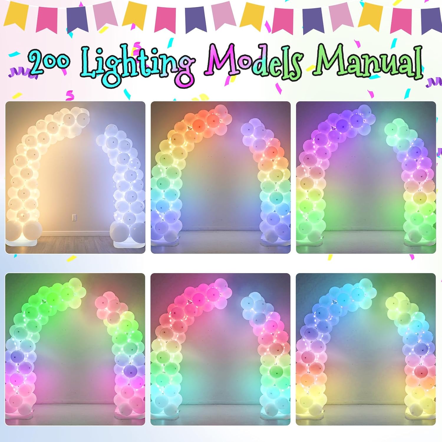 - .ćSuitable for both day and nightćTo solve the problem that the balloon arch stand cannot be displayed well in a bad light environment at night, we combine the light strings with 200 light modes with the balloon stand (Batteries not included), which can achieve good effects at night. The white light can well restore the style of the balloon scene you want, and other modes can be adjusted as you want.