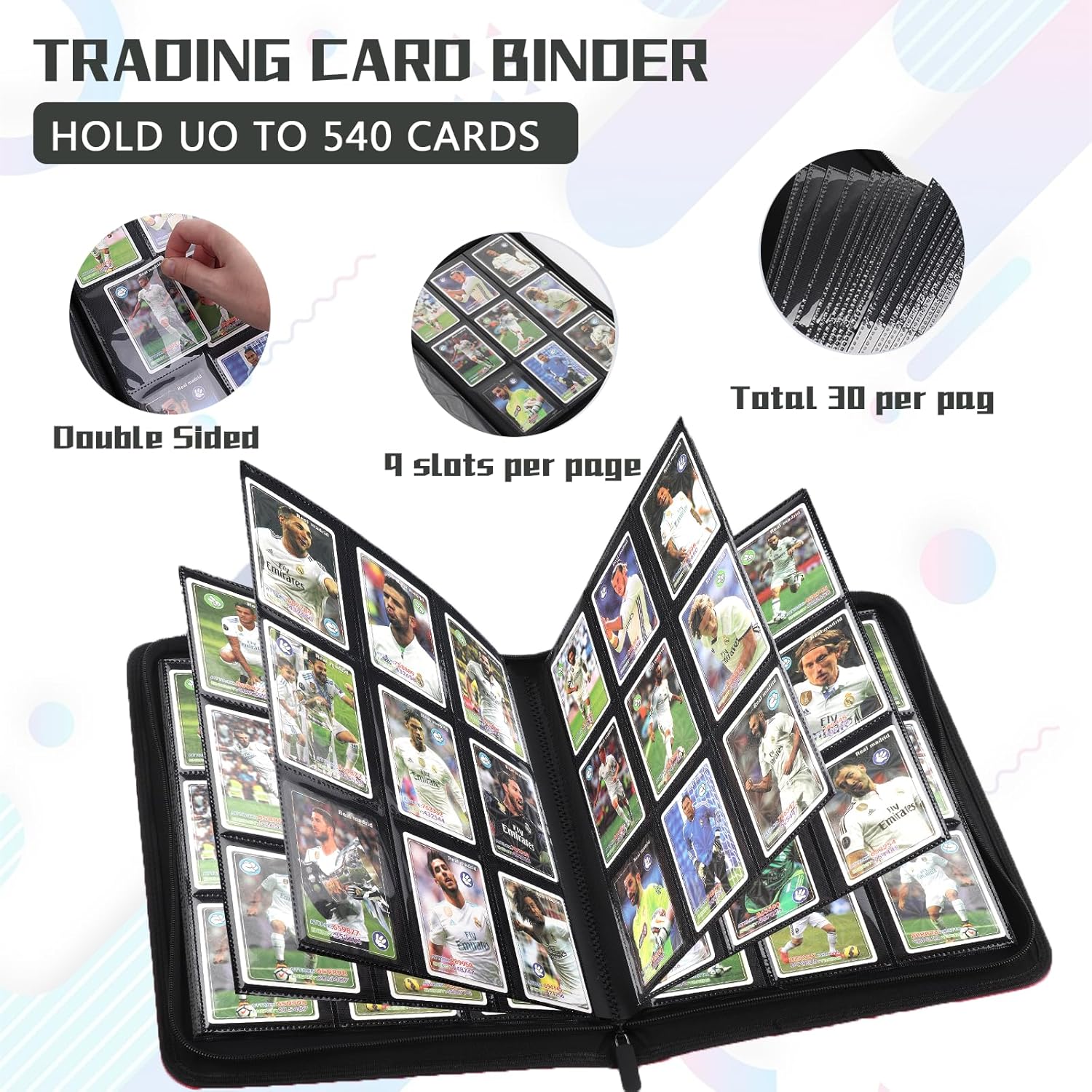 - LARGE CAPACITY CARD STORAGE:Smooth zippered card holder with 9 pockets per page,30 double sided pages hold up to 540 cards,providing plenty of space for card collectors and players to organize their cards