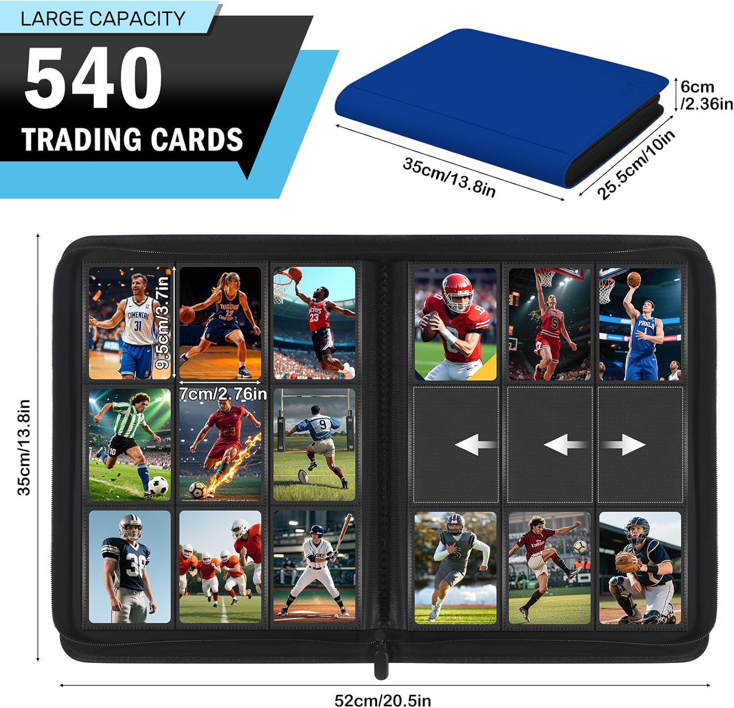 - Large Capacity: Zofly 9 pocket trading card binder is double sided and has 30 pages to hold 540 cards. This card storage album stronger protects and organizes your collectible cards in mint condition. Card Album Size: 10" x 13.8" x 2.36". Pocket Size: 2.76" x 3.74". Perfect for collectors of games, magic, sports, TCG, or amiibo cards, offering ample storage for all your trading cards everyday.