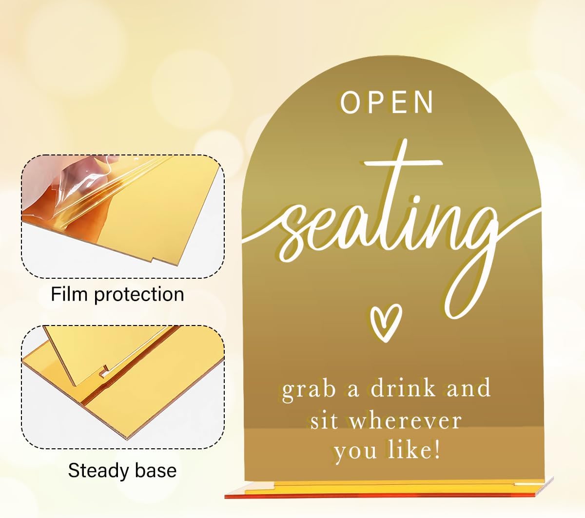 - 【Suitable Size】: Each wedding sign comes with a small acrylic base; the sign measures about 5 x 7 inches, and the acrylic base is about 4.3 x 1.2 inches. Each mirrored arch acrylic wedding sign has a protective film to prevent scratches, which should be torn off when ready to use.