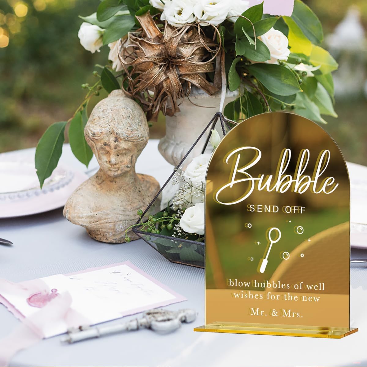 Acrylic Wedding Sign, Bridal Shower Decorations, Bubble Send Off Sign for Ceremony, Modern Font Table Signs, Gold Mirror Arched Acrylic Tabletop Signs for Wedding Reception and Event Party