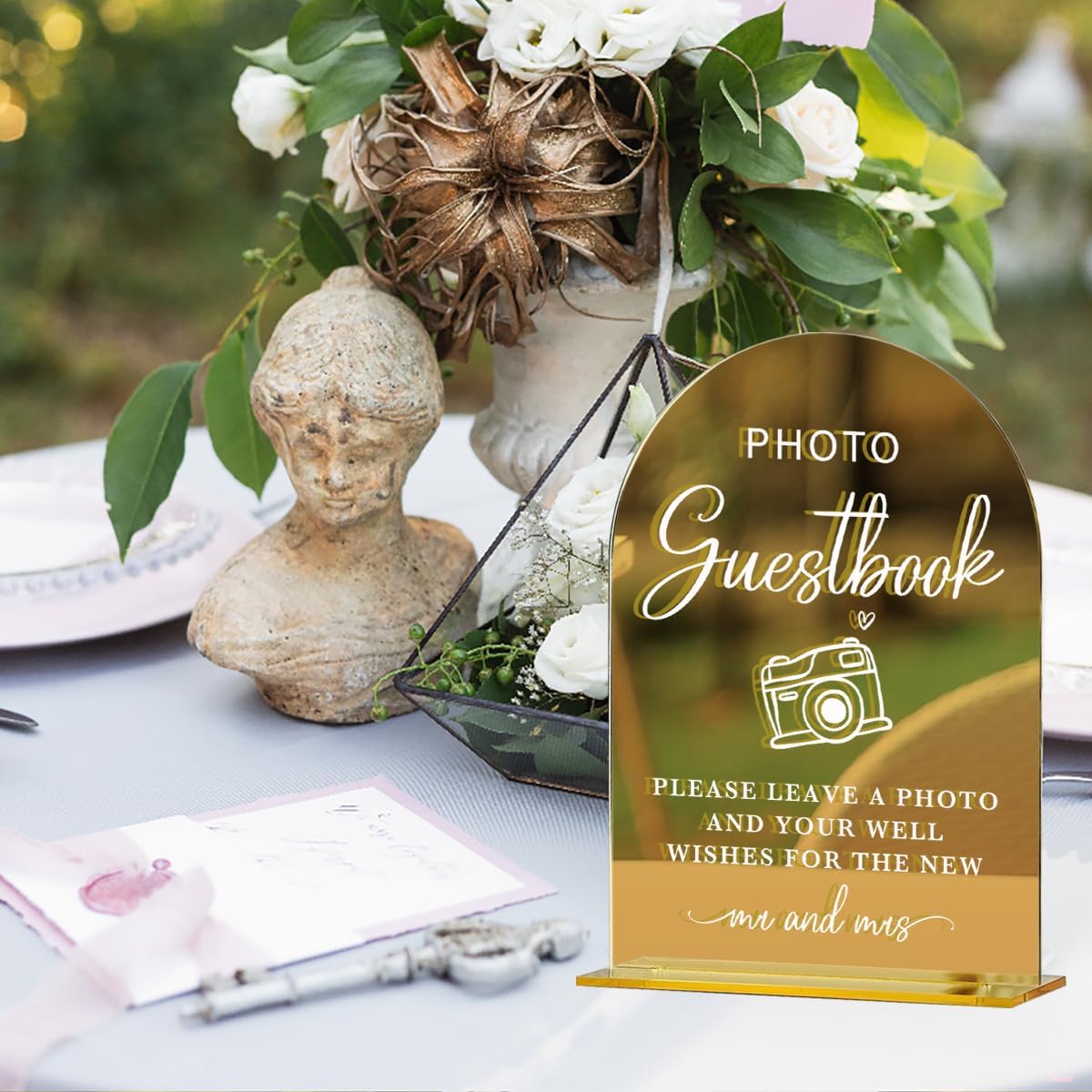 Acrylic Wedding Sign, Bridal Shower Decorations, Photo Guestbook Sign for Ceremony, Modern Font Table Signs, Gold Mirror Arched Acrylic Tabletop Signs for Wedding Reception and Event Party