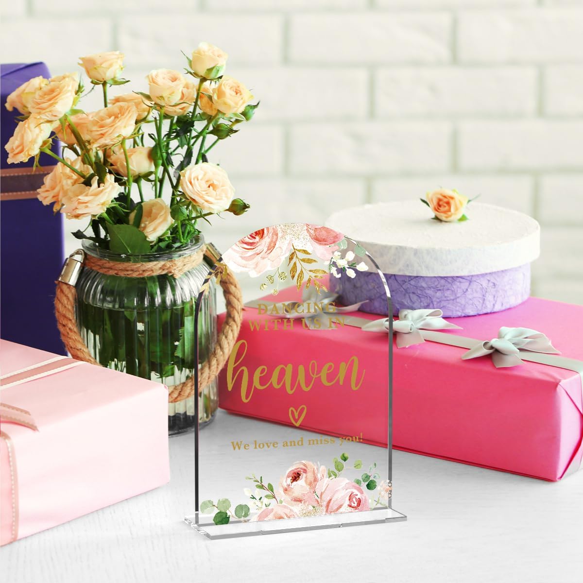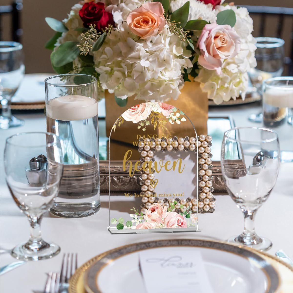 Acrylic Wedding Signs, Bridal Shower Decorations, Modern Calligraphy Arch Acrylic Table Top Sign for Wedding Reception and Engagement Parties - Dancing With Us in Heaven (Clear Pink Flowers)