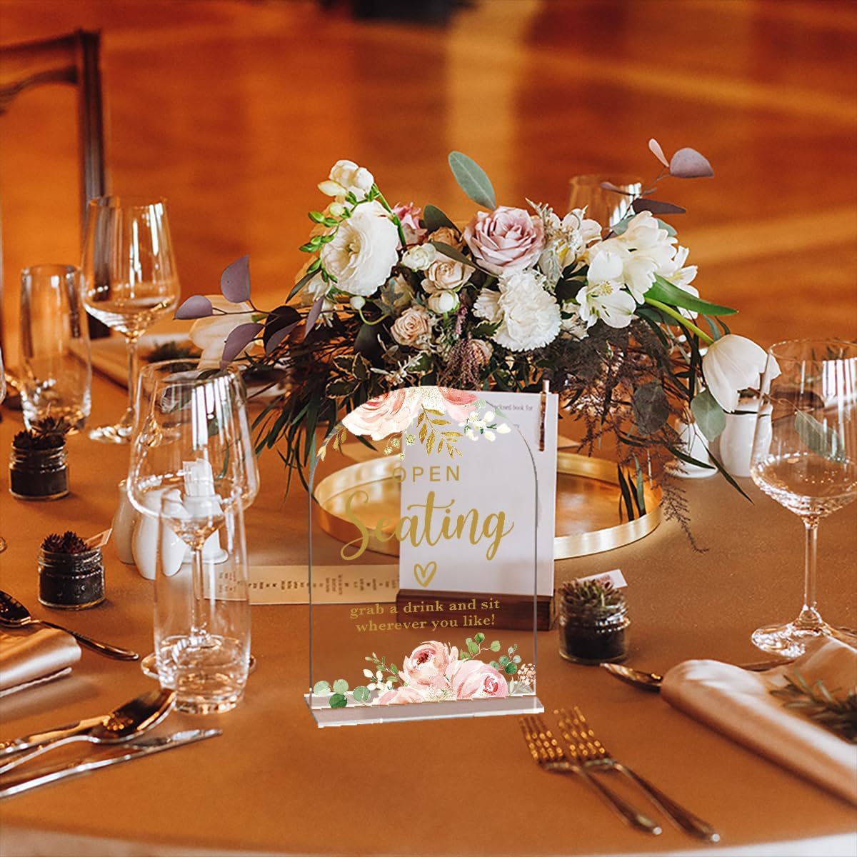 Acrylic Wedding Signs, Bridal Shower Decorations, Open Seating Signs for Reception, Modern Calligraphy Arch Acrylic Table Top Sign for Wedding Reception and Engagement Parties (Clear Pink Flowers)