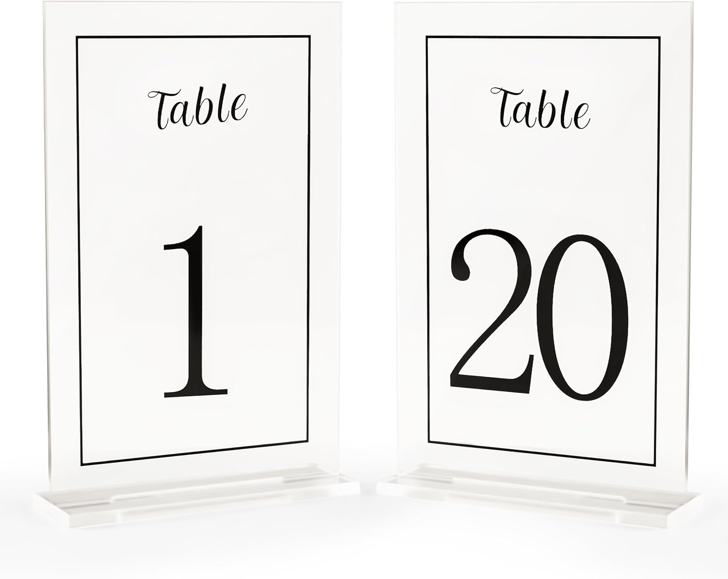 - [PREMIUM MATERIAL] These exquisite table numbers are beautifully designed in stunning shape with printed calligraphy and premium quality clear acrylic material. The slim and stable base offer superior stability. The table numbers and bases are covered with protective film to prevent scratching.