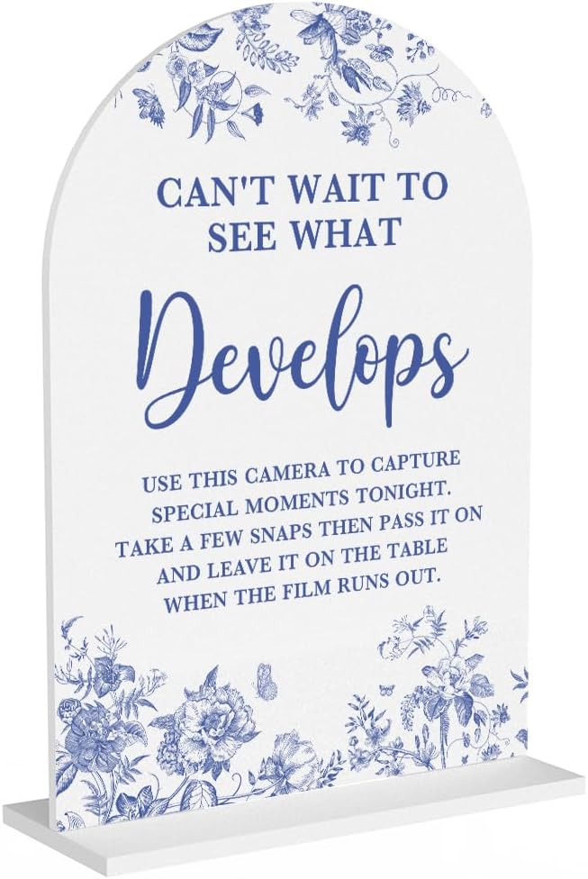 Acrylic Wedding Signs, Dusty Blue Wedding Decor, Blue Weddings Decor, Modern Calligraphy Arch Acrylic Table Top Sign for Weddings Parties Dinners - Can't Wait to See What Develops (White)
